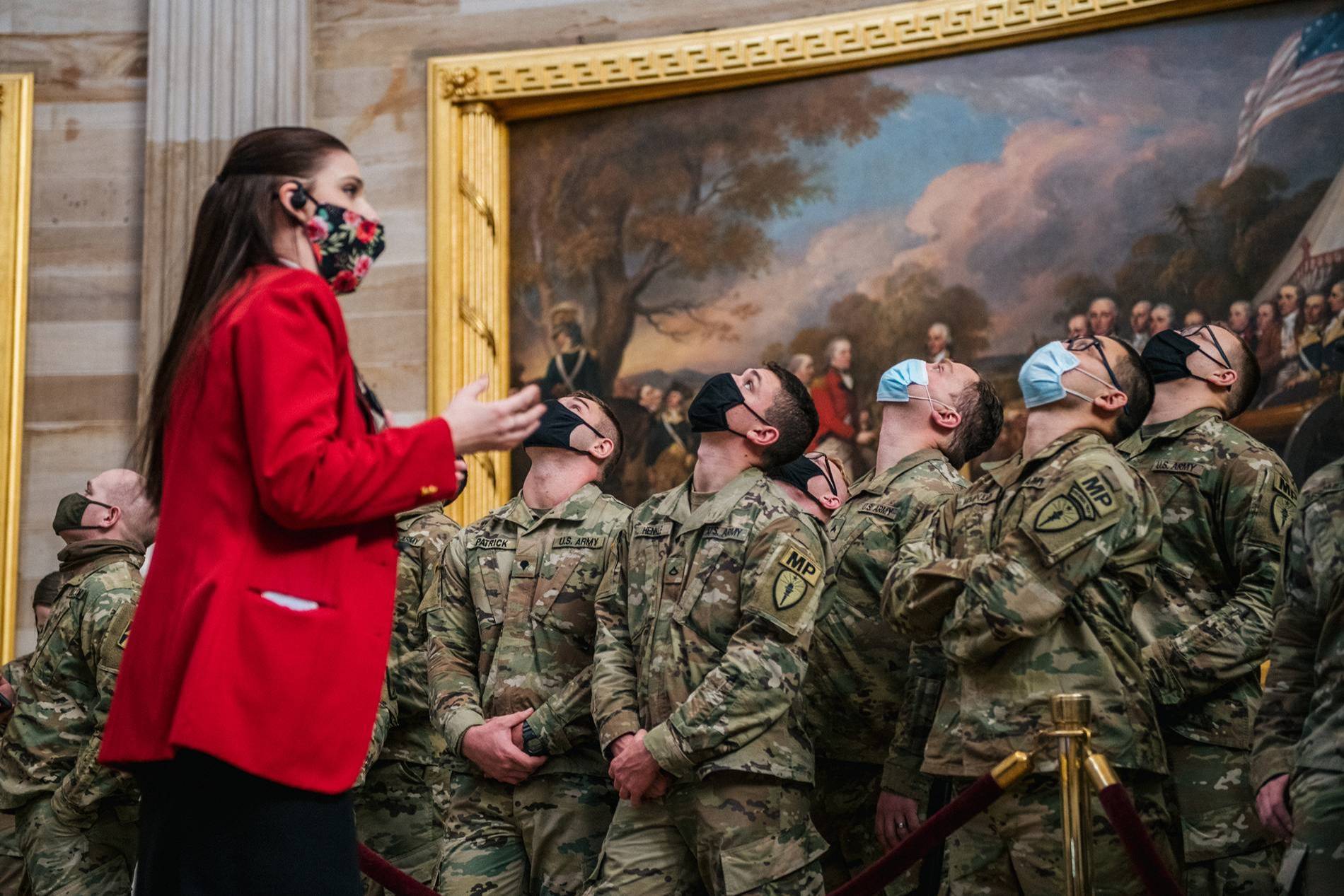 当地时间1月22日,一名美国官员表示,至少150名为总统就职典礼提供安保服务的国民警卫队队员新冠病毒检测结果呈阳性。美国总统就职典礼期间,共有25000名国民警卫队士兵在华盛顿执行安保工作。这名不愿透露姓名的官员表示,检测呈阳性的国民警卫队士兵人数可能会上升,但与就职典礼期间部署在该市的25000名士兵相比,感染者仍只是一小部分。据BBC报道,美总统就职典礼结束后,数千名国民警卫队员突然被要求撤出国会大厦,改睡停车场和室外,引发巨大争议。有士兵直言“感到难以置信的背叛”。事件发酵后,美国总统拜登道歉,第一夫人则带上白宫自制饼干,向国民警卫队致谢。图为当地时间1月23日,美国华盛顿特区,国民警卫队成员参观国会大厦。图片:人民视觉